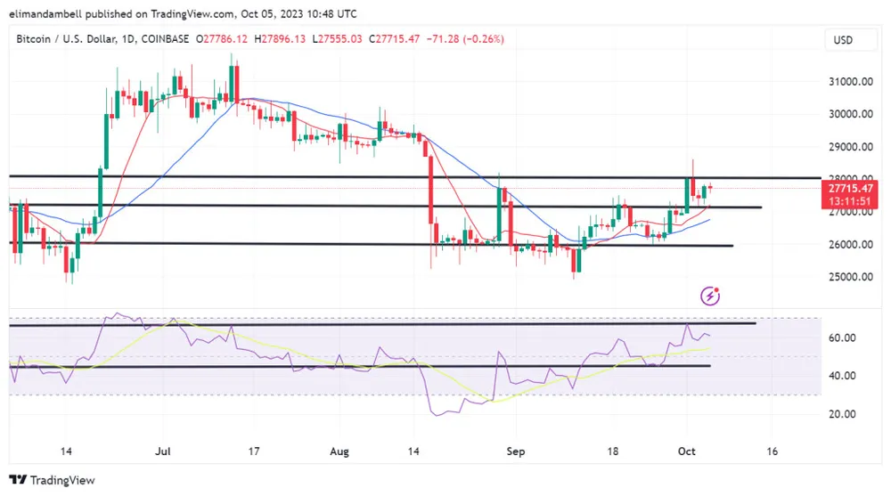 Cặp BTC/USD đạt đỉnh 27.875,59 USD vào đầu ngày hôm qua, theo sau mức thấp 27.339,27 USD vào ngày 4-10.