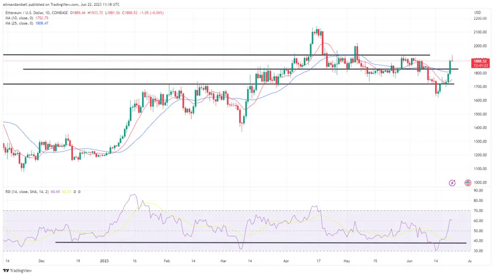 Sau mức thấp 1.812,37 USD vào thứ Tư (21/6), ETH/USD đã tăng lên mức cao nhất trong ngày hôm qua là 1.932,07 USD.