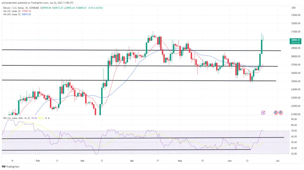 Đây là mốc mạnh nhất mà Bitcoin đạt được kể từ ngày 14-4, khi giá đạt đỉnh ở mức 31.050 USD.
