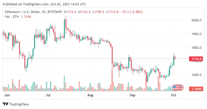 Cặp ETH/USD đạt mức cao nhất trong ngày là 1.750,60 USD vào đầu tuần, chưa đầy 24 giờ sau khi giao dịch ở mức thấp 1.670,08 USD.
