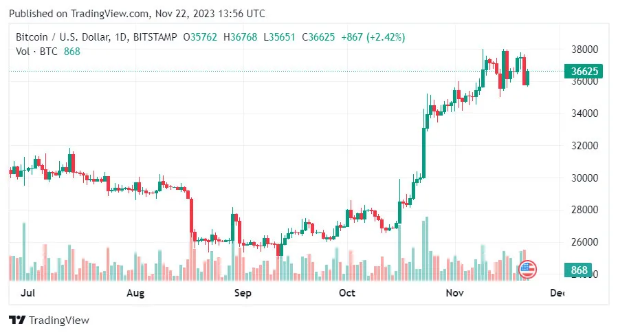 Kể từ ngày 22-11-2023, BTC thể hiện tâm lý trái chiều trên thị trường, với mức giá dao động ở mức 36.447 USD. Phạm vi giá trong 24 giờ cho thấy sự dao động trong khoảng từ 36.410 USD đến 37.409 USD, phản ánh những biến động đáng chú ý trong 24 giờ qua.
