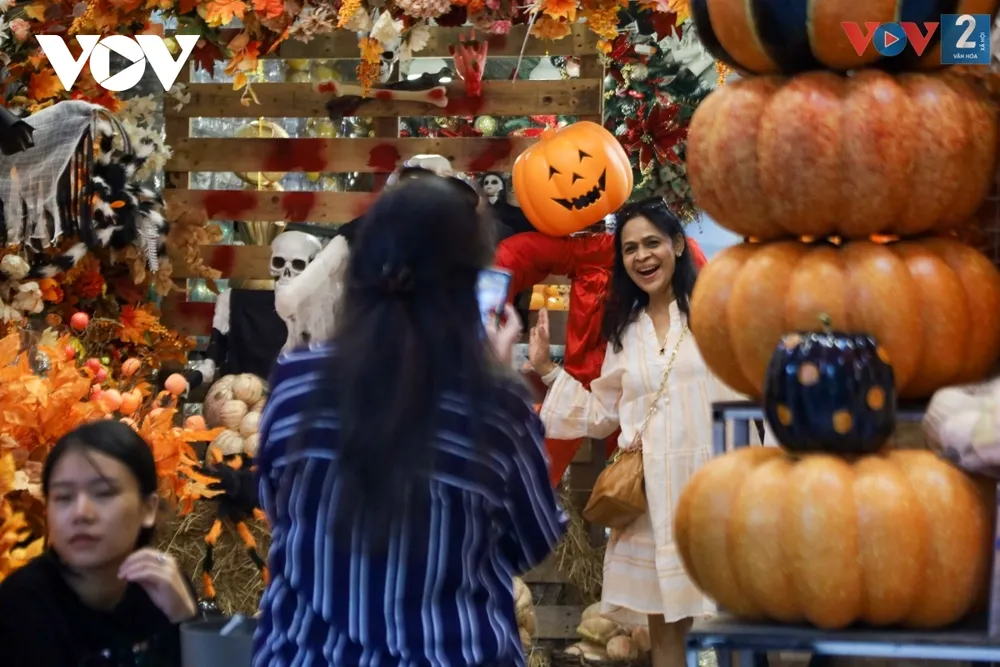 Những du khách nước ngoài thích thú trước không gian nhiều màu sắc và ma quái, đúng với tinh thần lễ hội hóa trang Halloween.