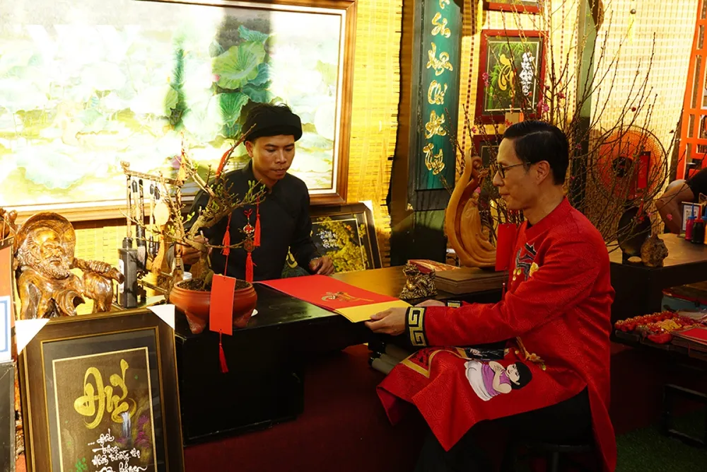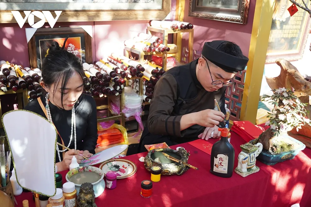 Nhóm bạn trẻ viết chữ và vẽ tranh theo yêu cầu của du khách tham quan Phố ông đồ