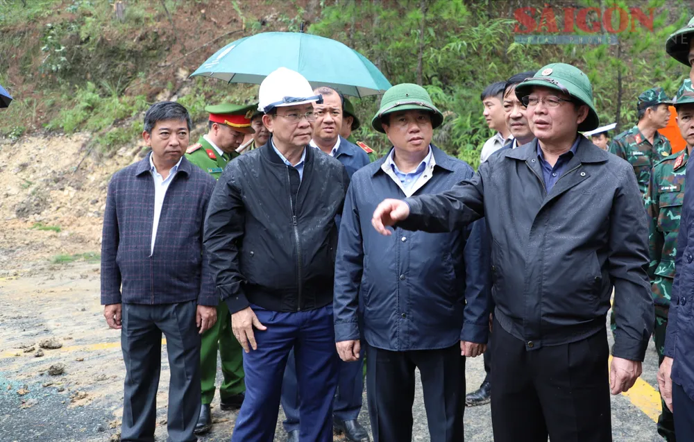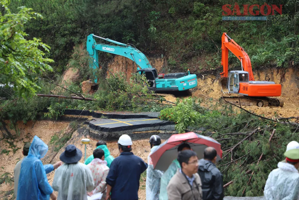 Phó Thủ tướng Hồ Quốc Dũng cùng lãnh đạo tỉnh Lâm Đồng kiểm tra tại khu vực sạt lở trên đèo Mimosa. Ảnh: ĐOÀN KIÊN
