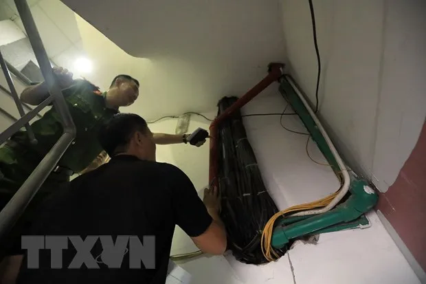 Một chung cư mini đục cả tường để lắp các loại dây điện ngay lối cầu thang bộ gây nguy hiểm cho người dân sinh sống ở đây. (Ảnh: Tuấn Anh/TTXVN)