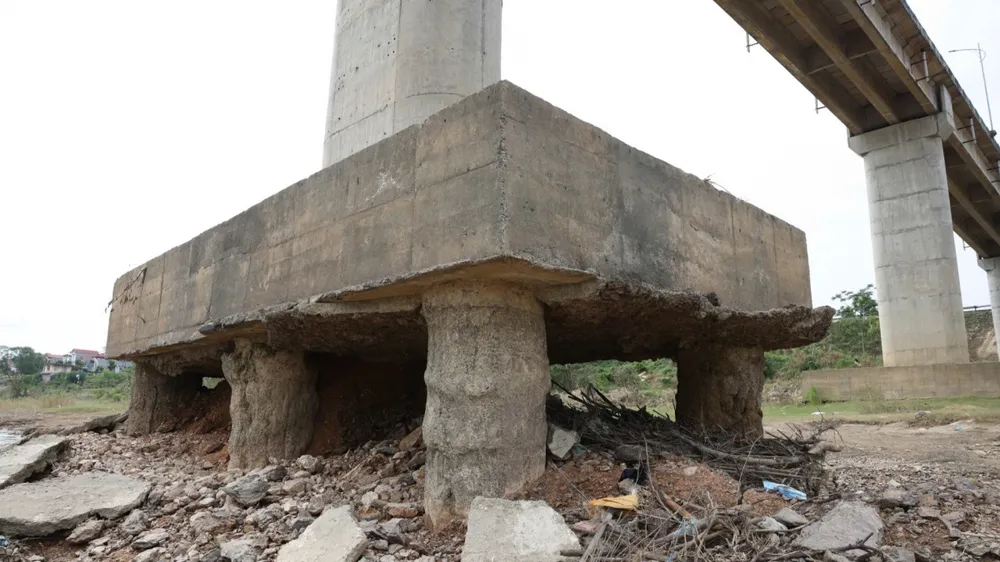 Hiện trạng trụ cầu T6 cầu sông Lô lộ rõ nhiều hư hại sau khi nước sông rút, bờ vở sạt lở.