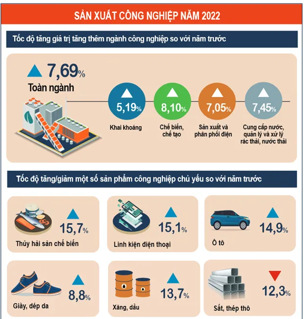 Trong số đó, ngành công nghiệp tiếp tục ghi nhận phục hồi và phát triển, với chỉ số sản xuất công nghiệp (IIP) năm 2022 ước tăng 7,8%, trong đó nhiều ngành công nghiệp trọng điểm tăng trưởng cao. Tổng mức bán lẻ hàng hóa và doanh thu dịch vụ tiêu dùng đạt 5,7 triệu tỷ đồng, tăng 20% đồng thời là mức tăng cao trong nhiều năm trở lại đây.