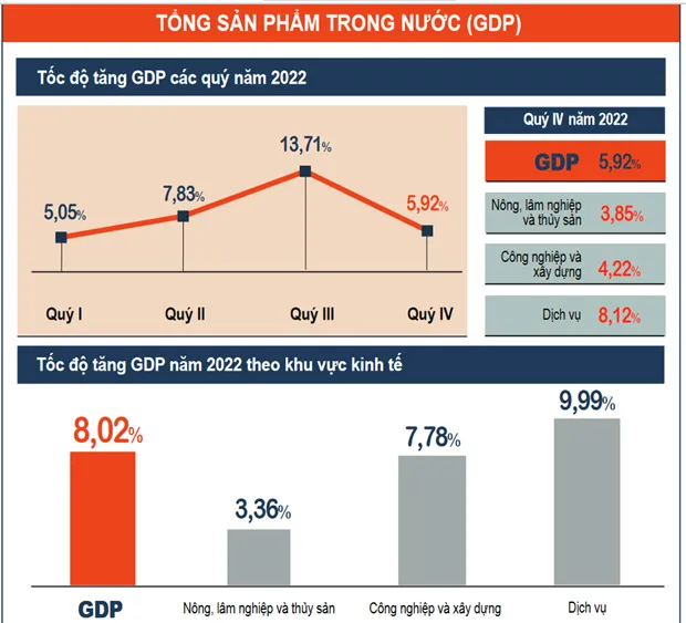 Cụ thể, chỉ số giá tiêu dùng (CPI) ước cả năm khoảng 3,15%, tăng trưởng GDP ước cả năm đạt khoảng 8,02% (mục tiêu là 6-6,5%) và đây là mức tăng cao nhất các năm trong giai đoạn 2011-2022. GDP bình quân theo giá hiện hành đạt 95,6 triệu đồng/người, tương đương 4.110 USD và tăng 393USD so với năm 2021.