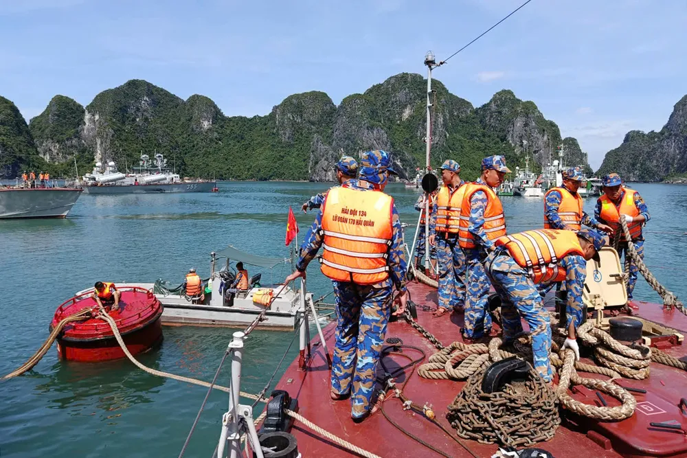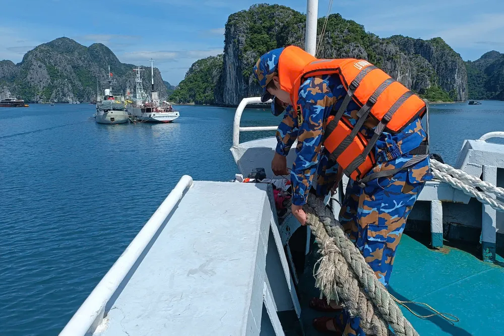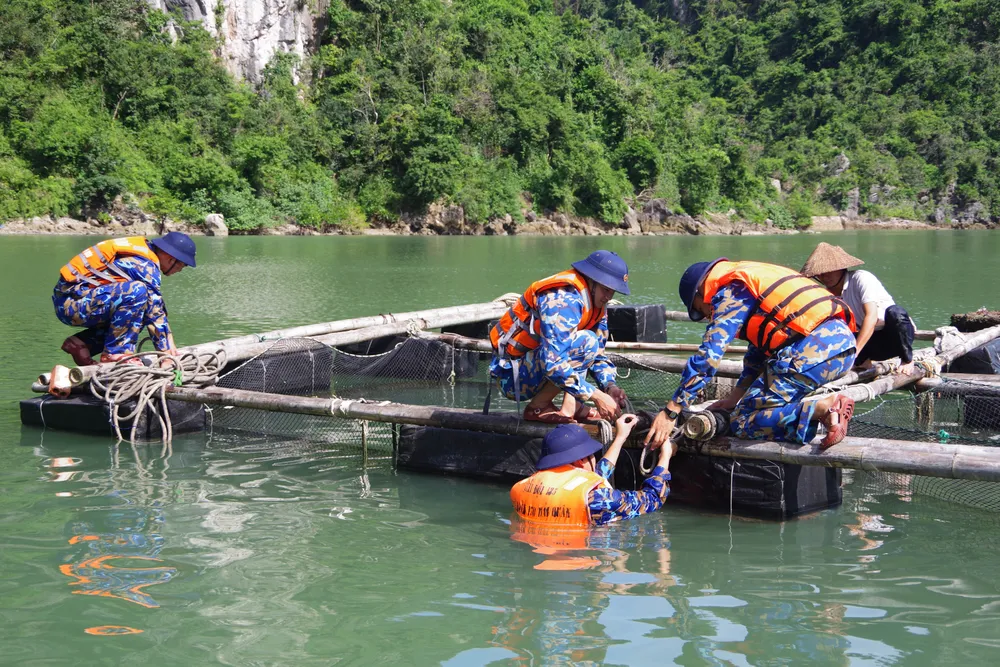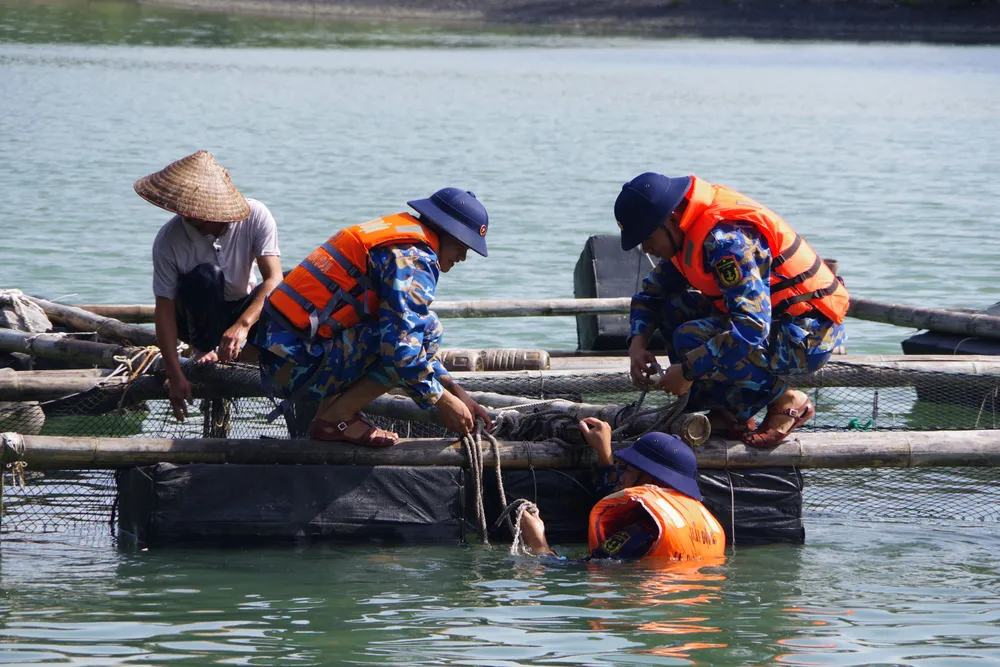 Cán bộ, chiến sĩ Lữ đoàn 170 giúp dân chằng gia cố, chằng buộc lồng bè nuôi thủy sản trên Vịnh Hạ Long