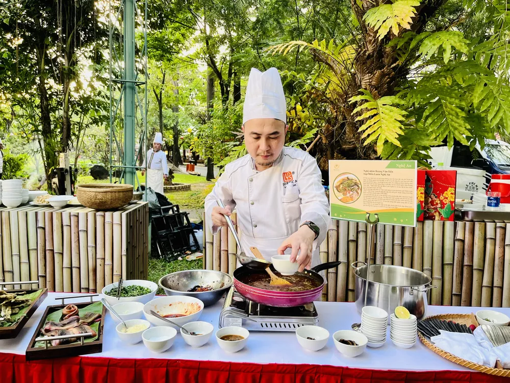 Nghệ nhân Hoàng Văn Tiến giới thiệu món súp lươn Nghệ An đến thực khách