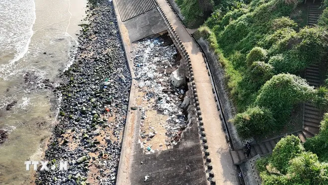 Nếu tình trạng sạt lở đoạn kè biển chắn sóng tiếp tục lan rộng, nguy cơ sụt lún đoạn đường phía trên hoàn toàn có thể xảy ra, kéo theo rủi ro ảnh hưởng đến Di tích quốc gia đặc biệt Địa đạo Vịnh Mốc (thuộc xã Cửa Tùng, tỉnh Quảng Trị). (Ảnh: Thanh Thủy/TTXVN)