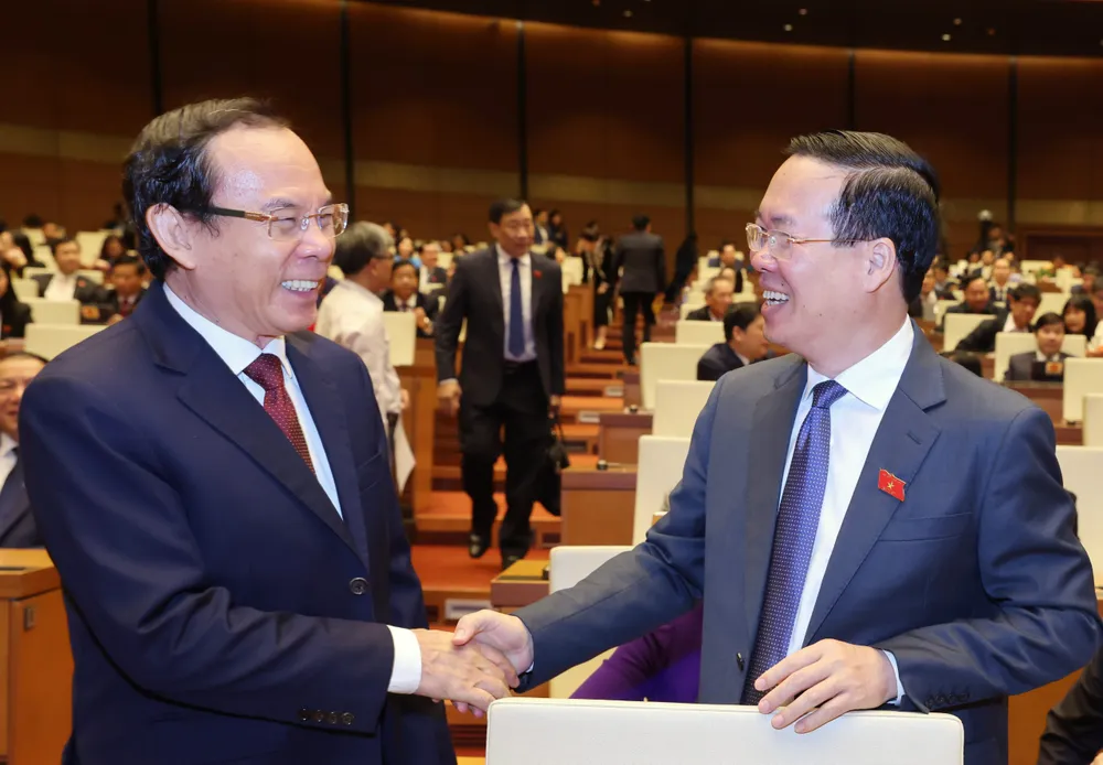 Chủ tịch nước Võ Văn Thưởng trao đổi với Bí thư Thành ủy TPHCM Nguyễn Văn Nên tại phiên bế mạc kỳ họp Quốc hội bất thường lần thứ 5, sáng 18-1. Ảnh: QUANG PHÚC