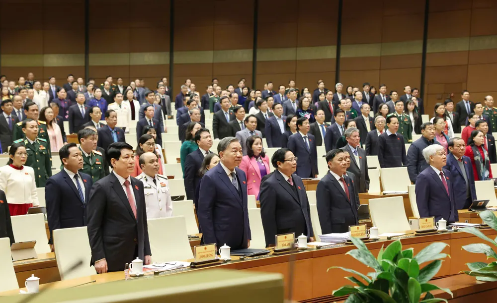 Các đại biểu Quốc hội thực hiện nghi thức chào cờ tại phiên khai mạc kỳ họp, sáng 12-2. Ảnh: QUANG PHÚC