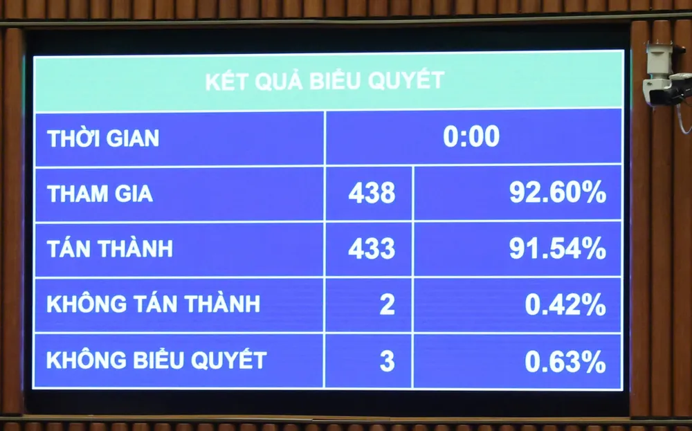 Kết quả biểu quyết thông qua Nghị quyết sửa đổi, bổ sung một số điều của Nghị quyết số 98/2023/QH15. Ảnh: QUANG PHÚC