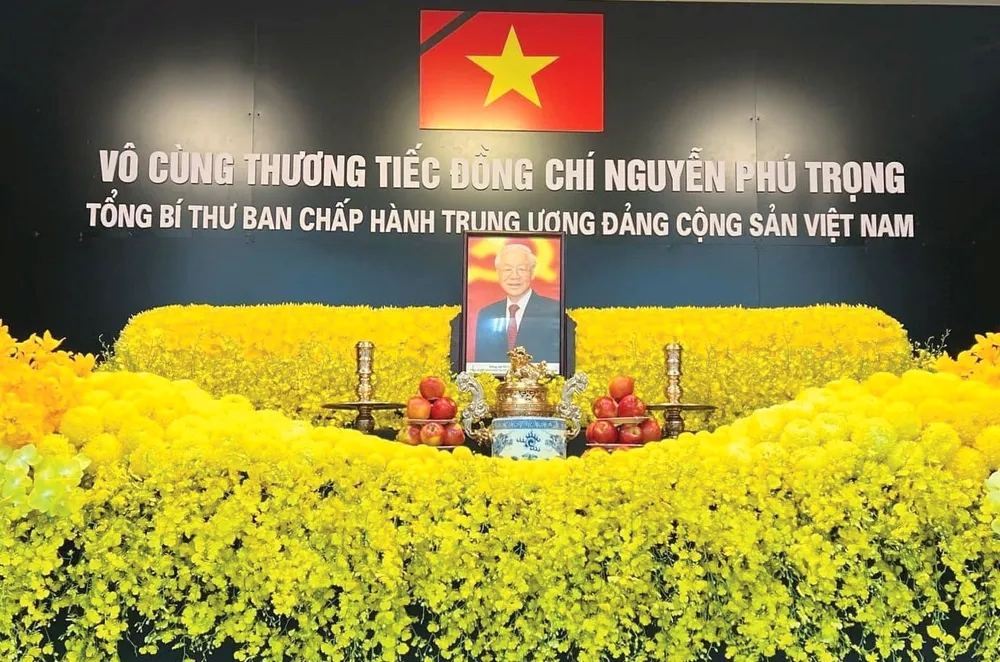 Bàn thờ Tổng Bí thư Nguyễn Phú Trọng trong hội trường Nhà Văn hóa thôn Lại Đà. Ảnh: NGUYỄN QUỐC