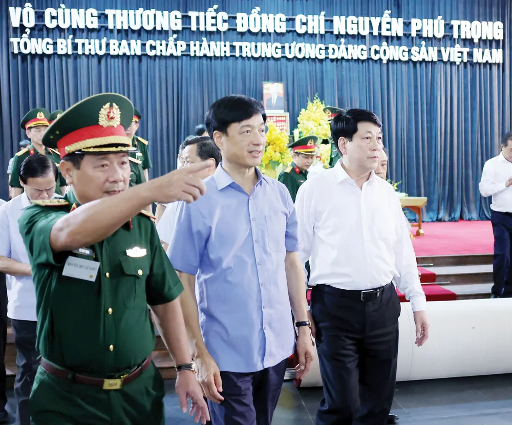 Thường trực Ban Bí thư Lương Cường (bìa phải) kiểm tra công tác chuẩn bị lễ tang tại Nhà tang lễ Quốc gia, chiều 24-7. Ảnh: QUANG PHÚC