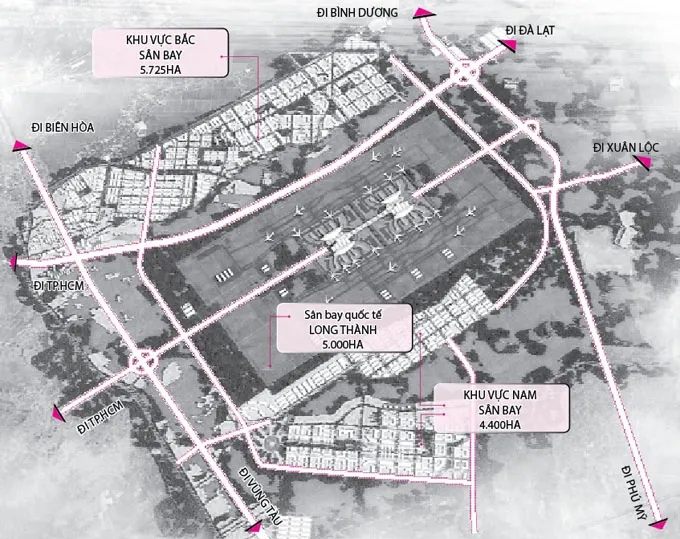 Theo quy hoạch đến năm 2025, ngoài diện tích 5.000ha làm sân bay quốc tế (đường băng, nhà ga, các cơ sở dịch vụ sân bay), khu vực thiết kế quy hoạch quanh sân bay rơi vào huyện Long Thành (gồm các xã Bình Sơn, Bình An, Cẩm Đường, Long An, Bàu Cạn, Lộc An, Tân Hiệp) và huyện Cẩm Mỹ (xã Xuân Quế, Thừa Đức, Sông Nhạn) với diện tích khoảng 21.000ha. Trong đó, khu vực bắc sân bay (hướng kết nối với TP.HCM) chiếm diện tích trên 5.720ha để làm khu nhà ở cho nhân viên hàng không, khu tái định cư, khu dịch vụ và vùng cây xanh.