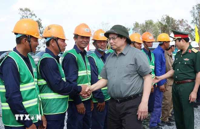 Thủ tướng Phạm Minh Chính thăm, động viên công nhân, kỹ sư thi công dự án đường bộ cao tốc Cần Thơ-Cà Mau đoạn qua thành phố Cà Mau. (Ảnh: Dương Giang/TTXVN)