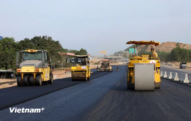 Nhà thầu huy động máy móc, nhân lực để thảm những mét bê tông nhựa cuối cùng để thi công tiếp hệ thống an toàn giao thông. (Ảnh: Khánh Hùng/Vietnam+)