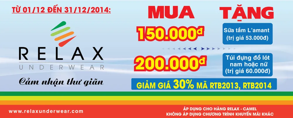 Theo đó, từ ngày 1 đến 31-12, sản phẩm RELAX triển khai chương trình khuyến mại dịp Noel hấp dẫn với hóa đơn 200.000 đồng quý khách hàng được tặng 1 túi đựng đồ lót trị giá 60.000 đồng cùng nhiều chương trình khuyến mại khác.