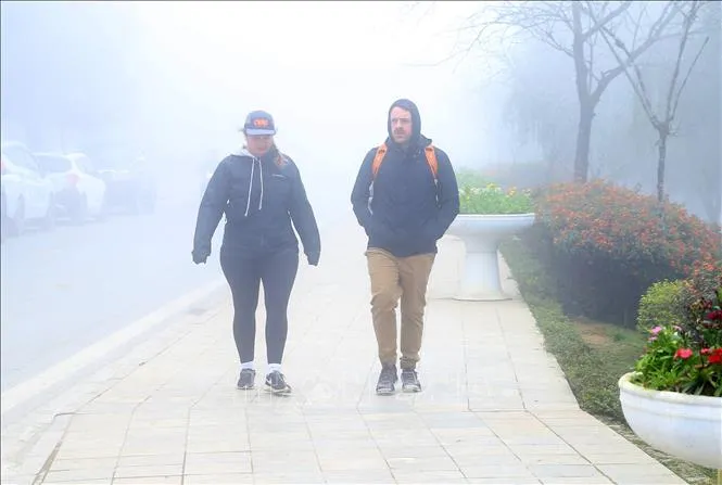 Không khí lạnh mạnh tác động tới Lào Cai khiến nhiệt độ các khu vực giảm sâu; rét đậm, rét hại bao phủ diện rộng. Tại khu du lịch Sa Pa ban ngày nhiệt độ vào khoảng 5-70C, sương mù nhiều ảnh hưởng đến hoạt động sinh hoạt, di chuyển của người dân và khách du lịch. Ảnh: TTXVN