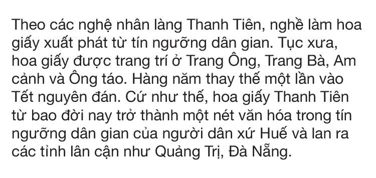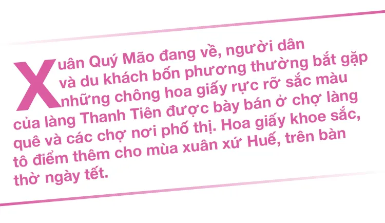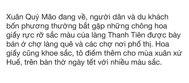 (ĐTTCO) - Xuân Quý Mão đang về, người dân và du khách bốn phương thường bắt gặp những chông hoa giấy rực rỡ sắc màu của làng Thanh Tiên được bày bán ở chợ làng quê và các chợ nơi phố thị. Hoa giấy khoe sắc, tô điểm thêm cho mùa xuân xứ Huế, trên bàn thờ ngày tết.