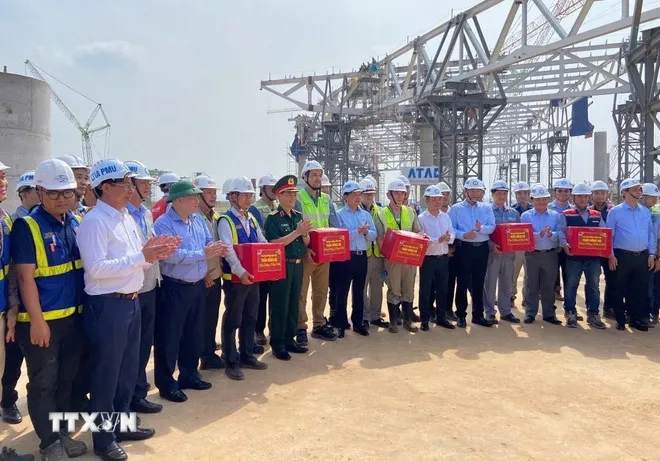 Phó Thủ tướng Trần Hồng Hà tặng quà cho nhà thầu, người lao động tại sân bay Long Thành. (Ảnh: Công Phong/TTXVN)