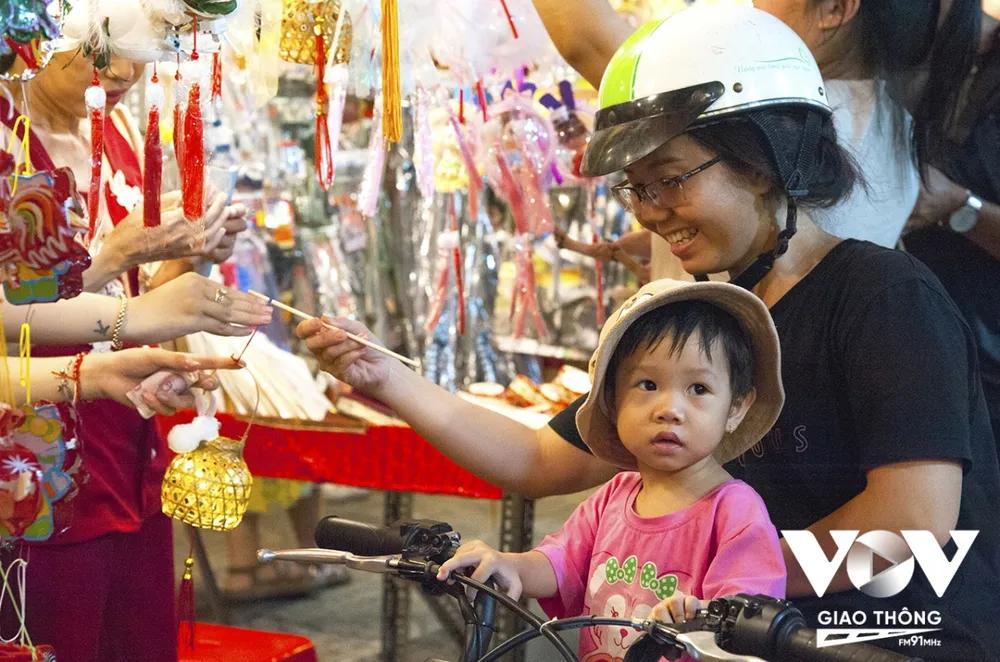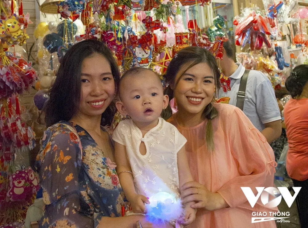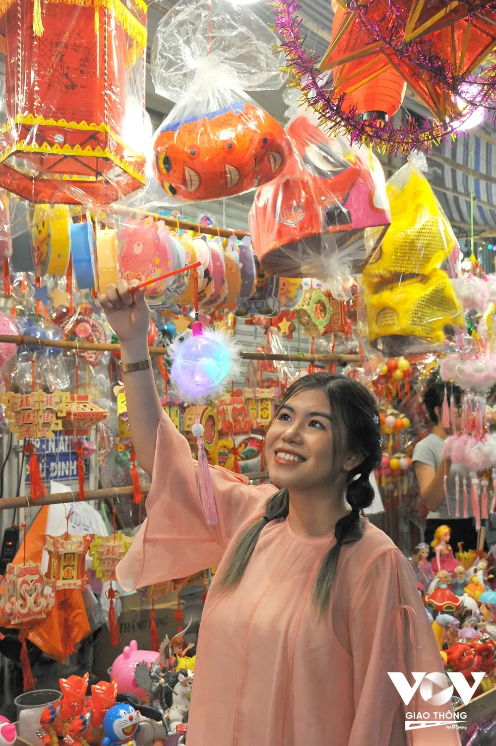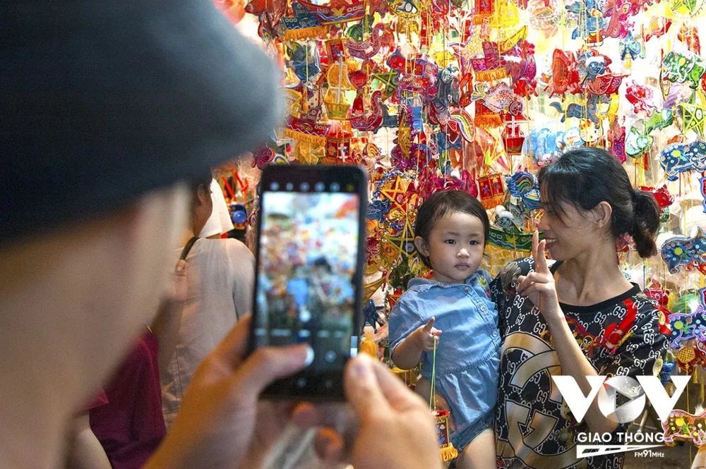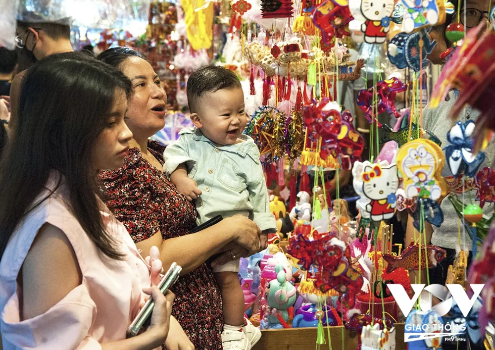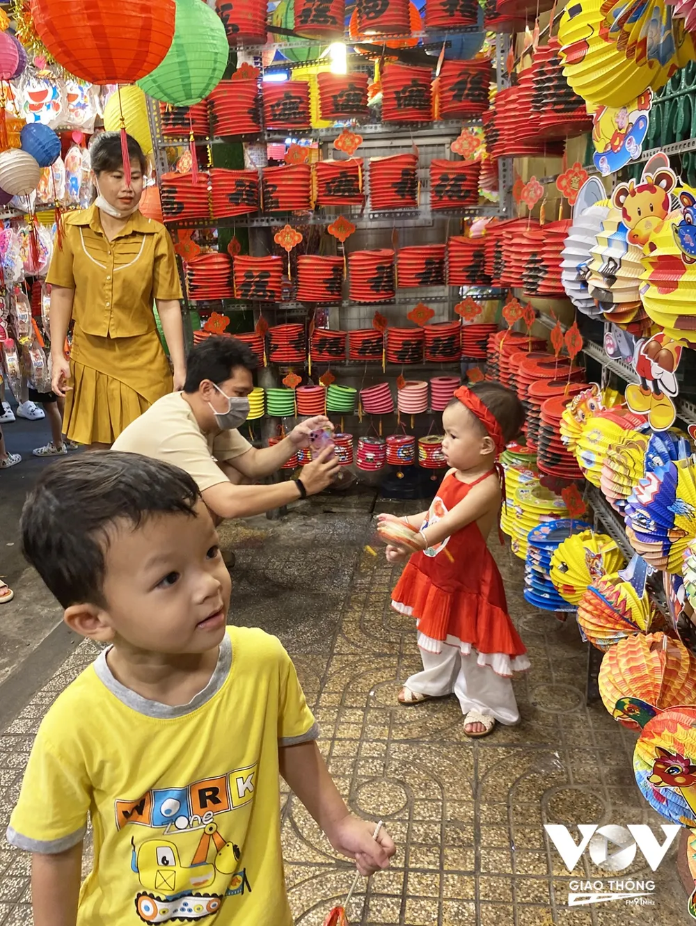 Từng dãy đèn lồng lung linh sắc màu như mời gọi, nhiều phụ huynh dẫn con em đến đây tham quan, mua sắm.