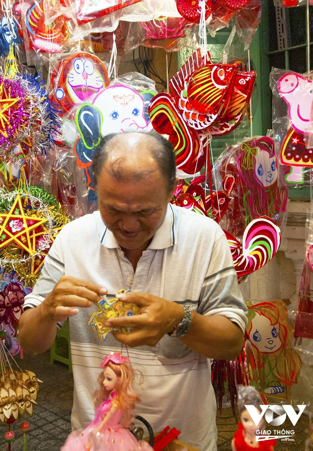 Chú Phát, một hộ kinh doanh lồng đèn tại ngôi nhà cổ (cửa lùa) đường Phú Đinh đang tỷ mẩn treo dây vào lồng đèn để trao cho các bạn khách nhỏ tuổi.