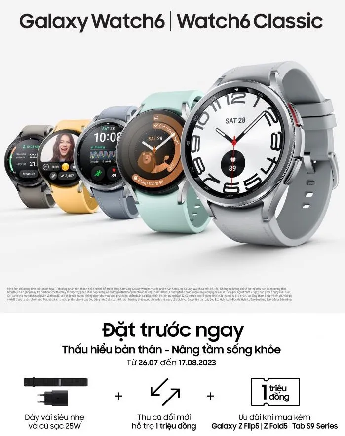 Nhân dịp này, Samsung Electronics cũng chính thức giới thiệu dòng sản phẩm mới Galaxy Watch6 và Galaxy Watch6 Classic, với định hướng thiết kế giúp người dùng xây dựng thói quen sống lành mạnh hơn. Galaxy Watch6 series tích hợp các tính năng chăm sóc sức khỏe toàn diện, hiệu suất mạnh mẽ, thiết kế tinh tế hoàn hảo với viền mỏng hơn, màn hình lớn sống động hơn và giao diện tương tác tốt hơn. Cả hai mẫu đồng hồ đều cho phép người dùng truy cập vào bộ sưu tập giao diện mặt đồng hồ đa dạng cũng như mang tới các tùy chọn dây đeo mới giúp người truyền cảm hứng để chinh phục mọi mục tiêu trong cuộc sống.