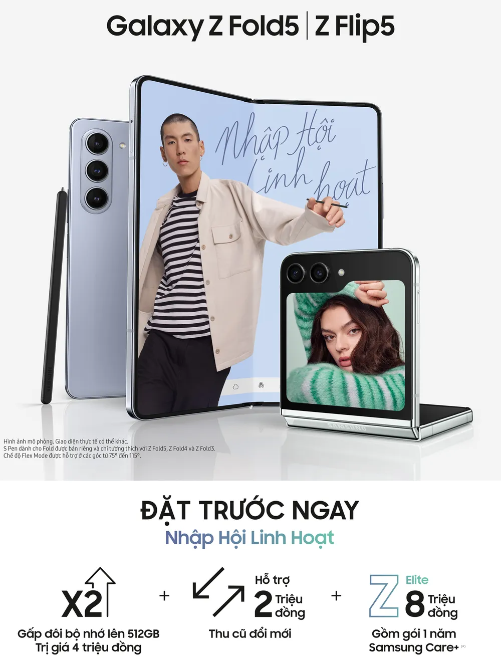 Giá bản lẻ đề nghị của bộ đôi Galaxy Z Fold5 và Galaxy Z Flip5 như sau: Galaxy Z Flip5 8+256GB: 25.990.000 đồng; Galaxy Z Flip5 8+512GB: 29.990.000 đồng; Galaxy Z Fold5 12+256GB: 40.990.000 đồng; Galaxy Z Fold5 12+512GB: 44.990.000 đồng và Galaxy Z Fold5 12+1TB: 51.990.000 đồng.