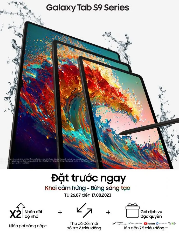 Giá bán lẻ đề nghị của Galaxy Tab S9 Series như sau:Galaxy Tab S9: từ 19.990.000 đồng; Galaxy Tab S9+: từ 25.990.000 đồng và Galaxy Tab S9 Ultra từ 32.990.000 đồng.