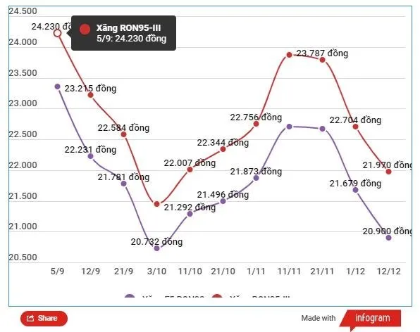 - Đến ngày 12/12, giá xăng đã giảm xuống mức thấp nhất từ đầu năm 2022: