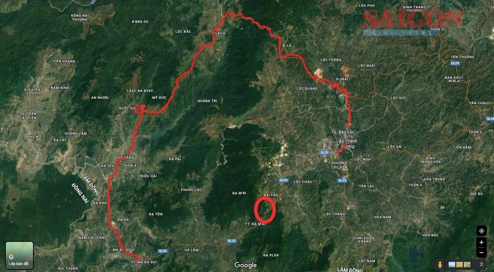 Đèo Bảo Lộc bị sạt lở (khoanh tròn) và hướng lưu thông cho các phương tiện từ TPHCM đi Đà Lạt và ngược lại sau khi đèo Bảo Lộc bị chia cắt