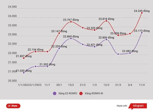 Lần gần đây nhất (ngày 11/4), sau khi trích lập quỹ bình ổn, giá xăng RON95-III tăng 1.120 đồng mỗi lít; xăng E5 RON92 tăng 1.091 đồng/lít, dầu diesel tăng 719 đồng. Dầu hỏa tăng 702 đồng/lít và dầu mazut tăng 765 đồng/kg.