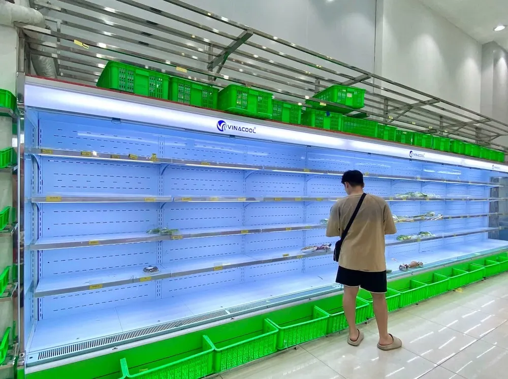 Kệ rau của một siêu thị trên đường Khuất Duy Tiến (Hà Nội) sạch trơn sáng 22-7. Ảnh: HUỲNH ANH