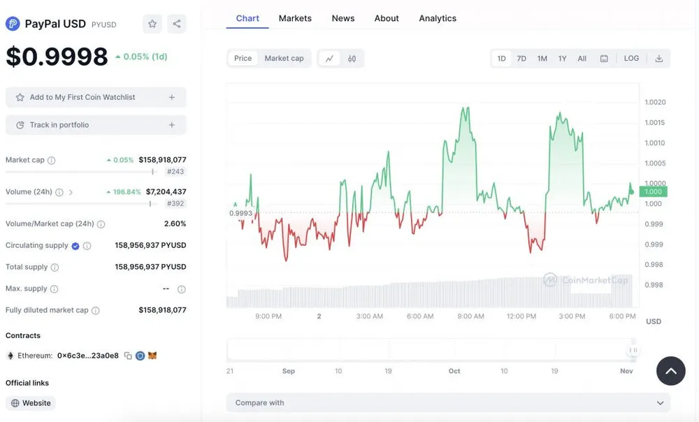 Tại thời điểm viết bài, PYUSD tự hào có vốn hóa thị trường khoảng 159 triệu USD, kèm theo khối lượng giao dịch hàng ngày gần 7,2 triệu USD, theo dữ liệu từ CoinMarketCap.
