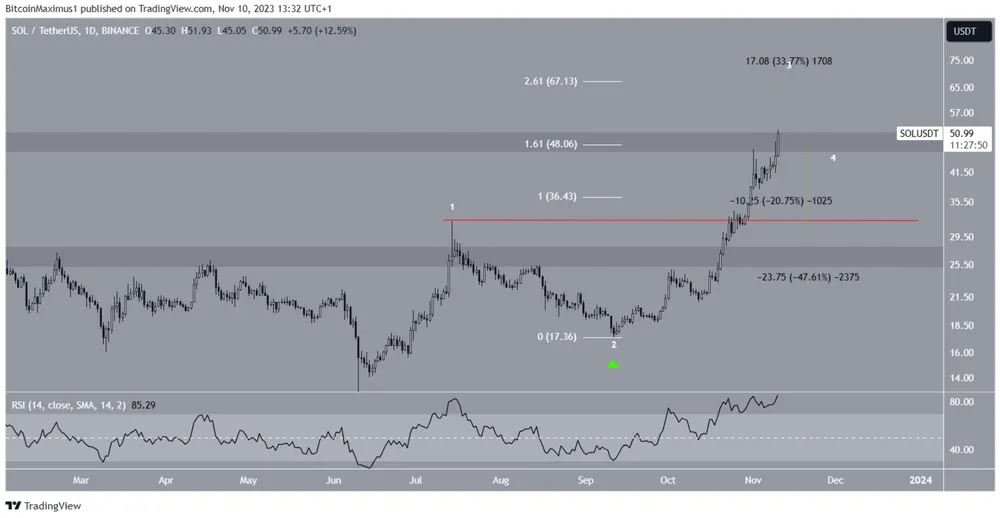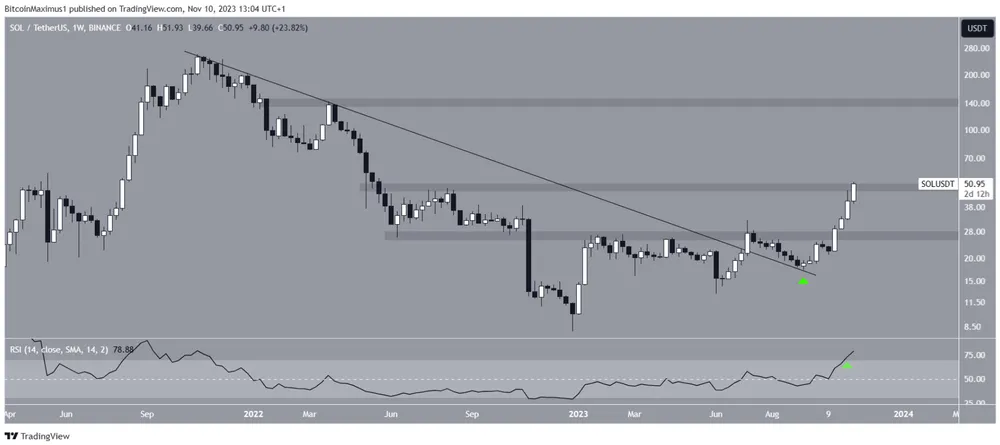 Đợt phục hồi diễn ra mạnh mẽ và giá SOL chưa trải qua bất kỳ đợt thoái lui nào. Trong quá trình di chuyển lên, giá SOL đã bứt phá vùng kháng cự 27 USD. Giá hiện đang vượt lên trên vùng kháng cự 50 USD nhưng vẫn chưa đạt được mức đóng cửa hàng tuần bên trên nó.