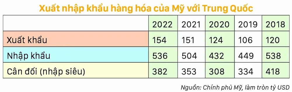 Trong suốt thời gian dài trong quan hệ thương mại song phương, Mỹ luôn là bên nhập siêu. Chỉ tính riêng giá trị hàng hóa nhập siêu, giai đoạn trước Covid-19, mỗi năm Mỹ nhập siêu khoảng 350-400 tỷ USD. Vì Covid-19, năm 2020 nhập siêu hàng hóa từ Trung Quốc của Mỹ giảm xuống còn 307 tỷ USD, nhưng qua năm 2021 và 2022 đã tăng lên lại lần lượt 353 tỷ và 382 tỷ USD.