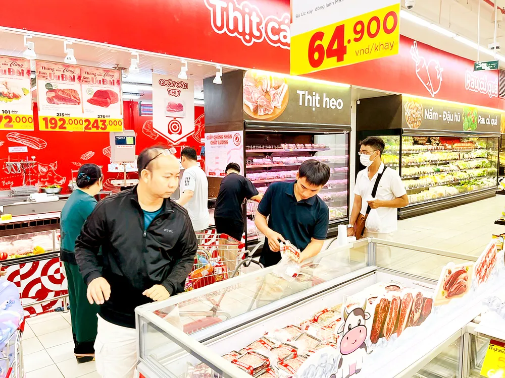 Người tiêu dùng chọn mua thực phẩm các loại thay vì tập trung vào thịt heo tại một siêu thị ở TPHCM