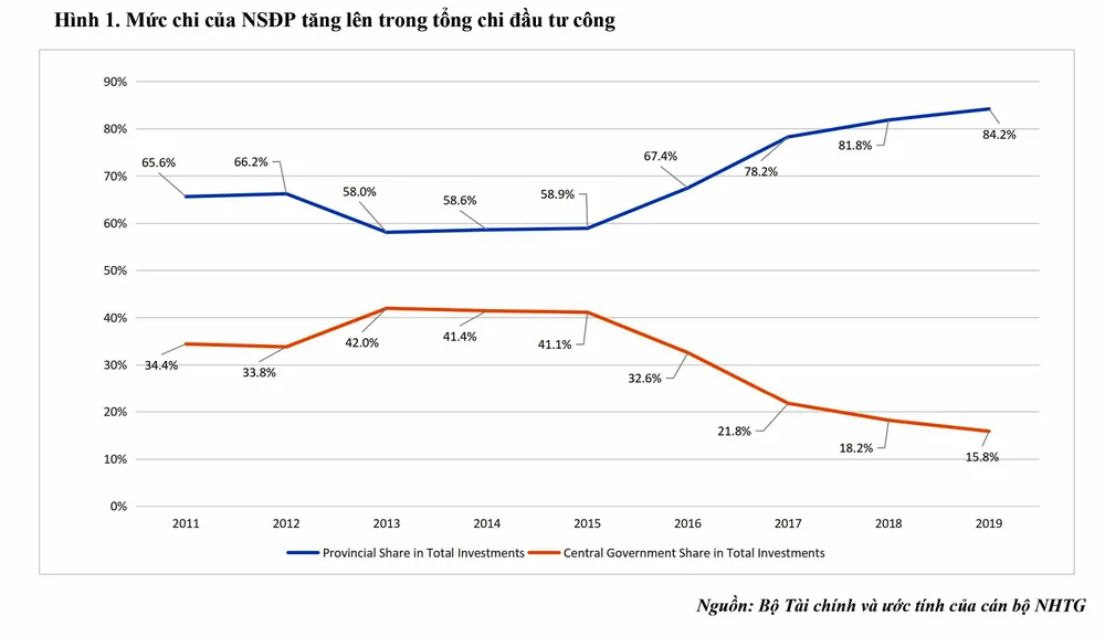 Trong bối cảnh đối với chi đầu tư, ngân sách trung ương chỉ chiếm khoảng 20% trong tổng chi đầu tư ngân sách nhà nước năm 2022, so với mức 40% cách đây 7 năm. Như vậy, chính sách phân cấp đã dành bình quân 80% đầu tư công được thực hiện qua các chính quyền địa phương giai đoạn 2017-2022 (Hình 1), sự chủ động của TPHCM là rất quan trọng.