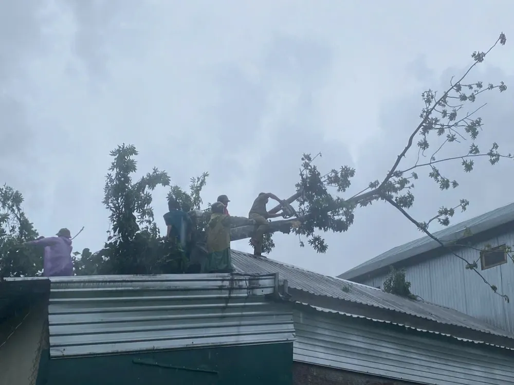 Công an huyện A Lưới, tỉnh Thừa Thiên Huế giúp cắt và di chuyển cây xanh đổ ngã vào nhà ông Hồ Văn Thiết, tổ dân phố 6, thị trấn A Lưới