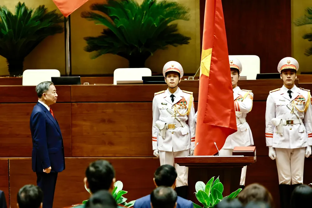 “Dưới cờ đỏ sao vàng thiêng liêng, trước Quốc hội, trước đồng bào cử tri cả nước, tôi, Chủ tịch nước CHXHCN Việt Nam, xin tuyên thệ: Tuyệt đối trung thành với Tổ quốc, với nhân dân, với Hiến pháp nước CHXHCN Việt Nam; nỗ lực phấn đấu hoàn thành tốt nhiệm vụ mà Đảng, Nhà nước và nhân dân giao phó”, đồng chí Tô Lâm khẳng định.
