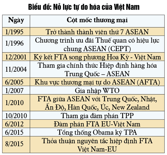 Thực hiện chính sách Đổi mới kinh tế từ năm 1986, Việt Nam đã liên tục đạt được những thành quả ấn tượng trong hoạt động thương mại và đầu tư: Gia nhập khối ASEAN (Hiệp hội các quốc gia Đông Nam Á) trở thành thành viên chính thức vào năm 1995; tham gia vào những nỗ lực tự do hóa khu vực ASEAN hướng tới một thị trường và cơ sở sản xuất thống nhất (biểu đồ). Hoạt động xuất khẩu của nước ta cũng tăng từ 5 tỷ USD vào năm 1995 lên 150 tỷ USD trong năm 2014, một phần nhờ vào việc mở cửa các hoạt động đầu tư và thương mại.