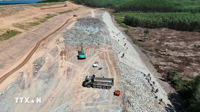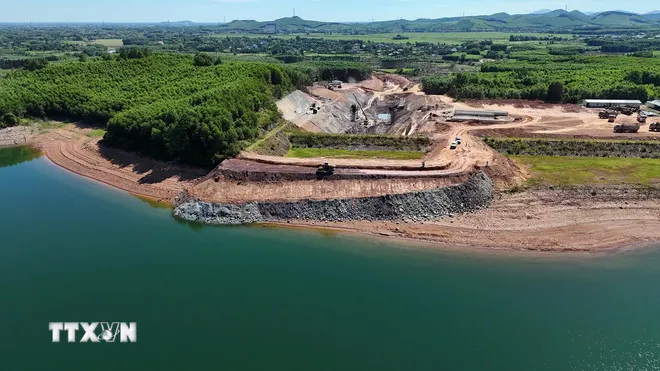 Tràn xả lũ mới tại hồ Kẻ Gỗ đang được khẩn trương thi công. (Ảnh: Hữu Quyết/TTXVN)