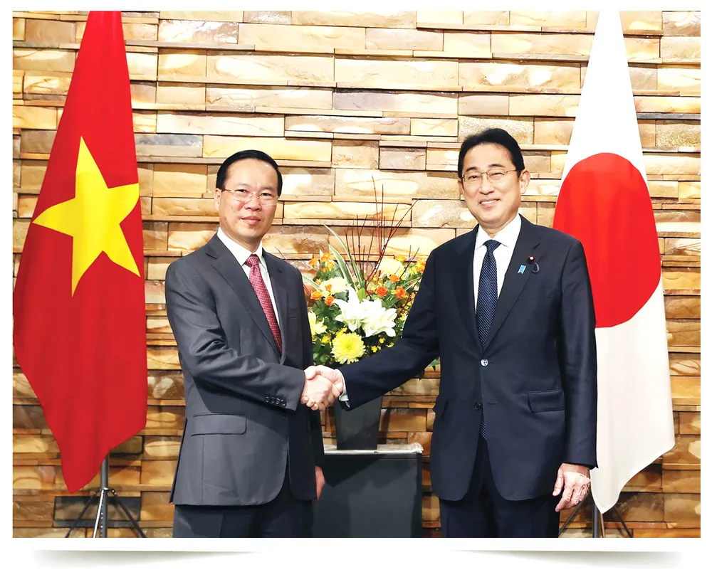 Chủ tịch nước Võ Văn Thưởng và Thủ tướng Nhật Bản Kishida Fumio tại hội đàm ngày 27-11-2023, ngay sau lễ đón trọng thể Chủ tịch nước Võ Văn Thưởng và phu nhân cùng đoàn đại biểu cấp cao Việt Nam thăm chính thức Nhật Bản. Hai bên ra Tuyên bố chung về nâng cấp quan hệ lên Đối tác Chiến lược toàn diện vì hòa bình và thịnh vượng tại châu Á và trên thế giới.
