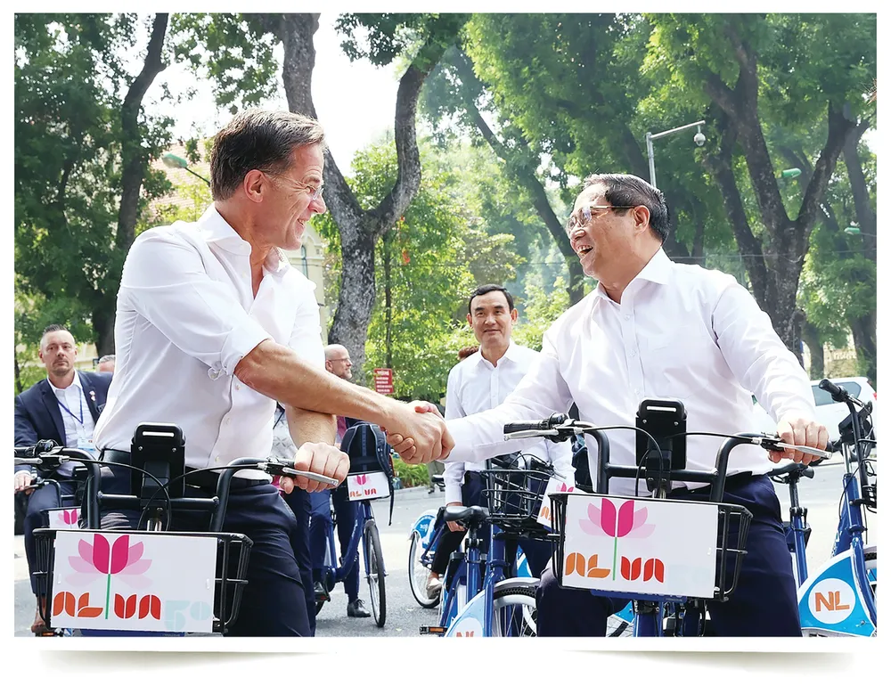 Thủ tướng Phạm Minh Chính và Thủ tướng Hà Lan Mark Rutte đạp xe dạo thăm đường phố Hà Nội, sáng 2-11-2023.