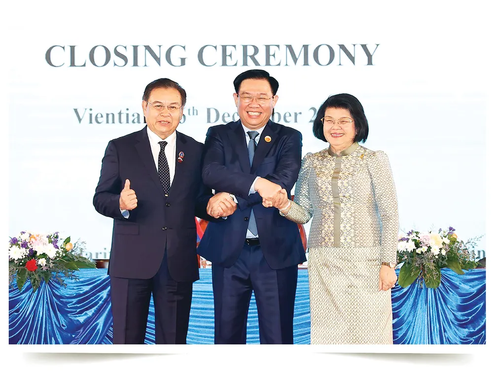 Chủ tịch Quốc hội Vương Đình Huệ, Chủ tịch Quốc hội Lào Saysomphone Phomvihane và Chủ tịch Quốc hội Vương quốc Campuchia Samdech Khuon Sudary dự Lễ bế mạc Hội nghị cấp cao Quốc hội ba nước Campuchia - Lào - Việt Nam lần thứ nhất tại thủ đô Vientiane, CHDCND Lào, ngày 6-12-2023.