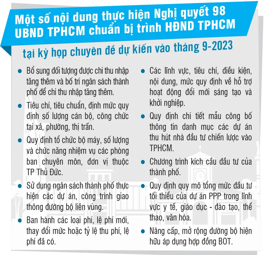 UBND TPHCM cũng phân công nhiệm vụ cụ thể, rõ trách nhiệm, thời gian cho thủ trưởng từng sở, ban, ngành, đơn vị. Trong đó, dự kiến kỳ họp HĐND vào tháng 9, UBND TP sẽ trình 19 tờ trình; và kỳ họp cuối năm vào tháng 12 sẽ trình 7 tờ trình cụ thể hóa các cơ chế, chính sách tại Nghị quyết 98. Trong đó, có tổ chức bộ máy, cơ chế hoạt động của TP Thủ Đức; các nội dung phân cấp, ủy quyền; thành lập Sở An toàn thực phẩm; một số dự án BOT…