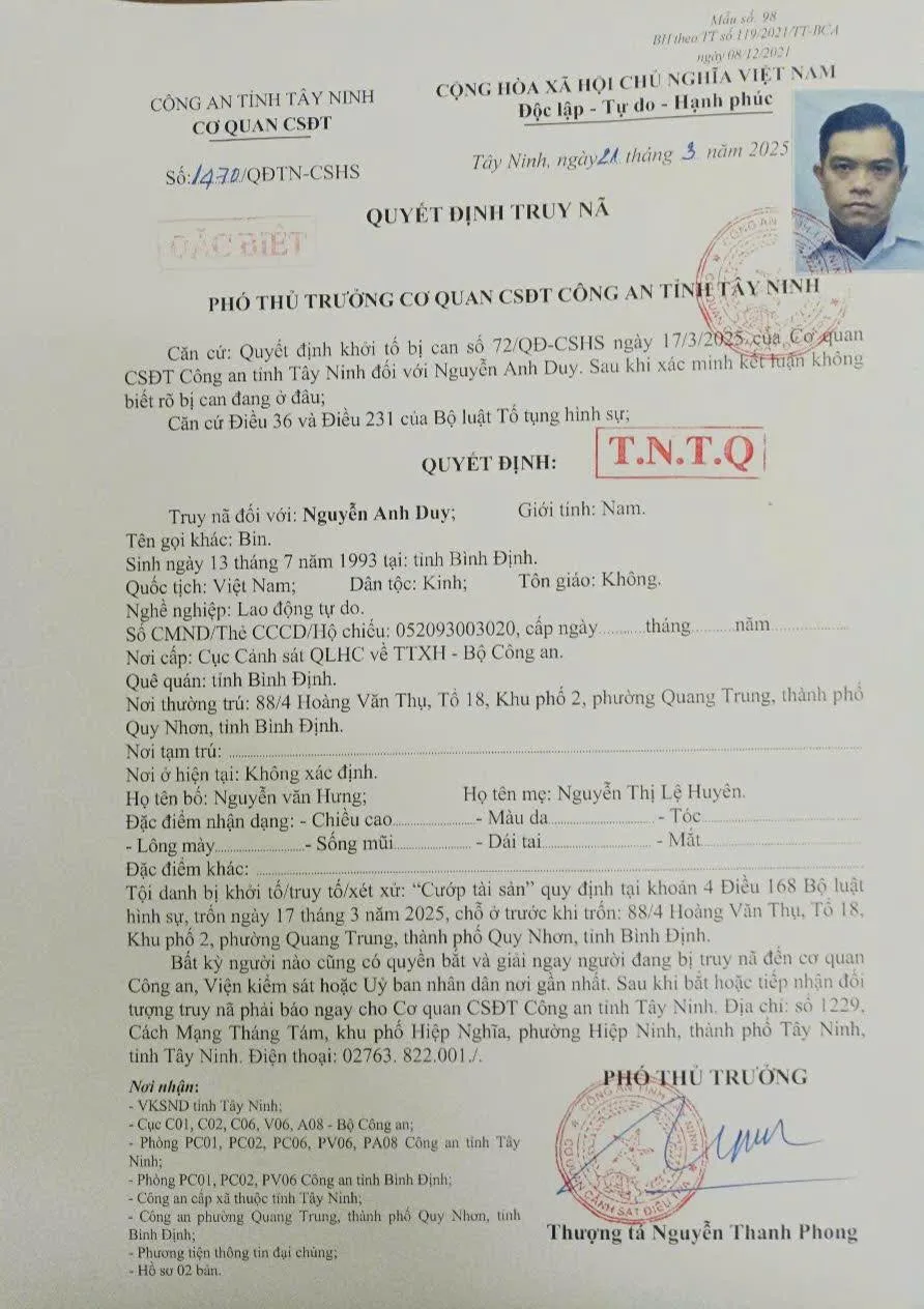 Quyết định truy nã đặc biệt đối tượng Nguyễn Anh Duy